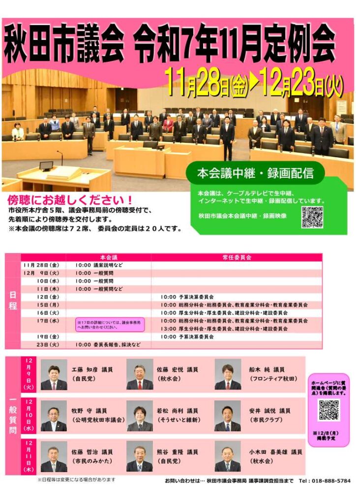 2025(令和7)年11月28日に本会議があり、26日間の令和7年11月秋田市議会定例会(11月議会)が始まりました。市長説明があり、条例案12、単行案5、予算案(補正予算)14、人事案1の合計32件を審議することになります。
