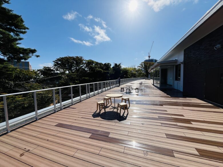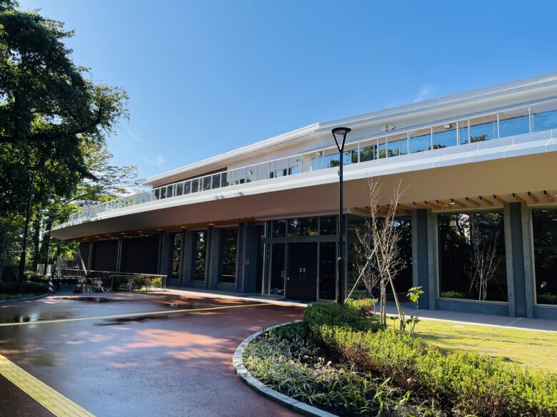 The building is compact, but it doesn’t feel small. It fits beautifully into the natural surroundings of Senshū Park. The first-floor terrace under the long roof and the open second-floor terrace both offer wide views of the park’s main gate and Ninomaru Square. Since these terraces can be used even when the museum is closed, I thought they will be a lively spot during the cherry blossom season, and convenient for daily use as well.