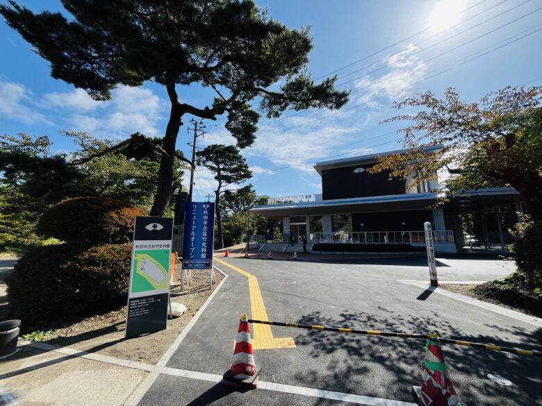 2025年(令和7年)10月17日(金)に、秋田市議会議員や関係者向けの内覧会があり、参加してきました。コンパクトですが狭さを感じない作りで、千秋公園の自然の中に溶け込んだ素敵な施設でした。長い庇の下の1階のテラスや開放感のある2階のテラスは、千秋公園表門や二の丸広場を見渡せる広々としたスペースで、閉館時も入れることからお花見の時期には賑わいそうだなぁと思いましたし、普段からも使い勝手が良さそうでした。肝心の歴史史料は見応えのあるものが多く、特に甲冑は全面ガラス張りのケースに入っていますのでどの角度からも近くでじっくり見ることができるのはかなり珍しいとのこと。全ての史料にはQRコードが付いており、5ヶ国語での説明が聞けるとのこと。歴史史料の素晴らしさや展示の良さはさることながら、施設全体がとても素敵で、展望テラスなど公共スペースが多いので、千秋公園に行くついでに施設を見学に行くのでも楽しいと思います。